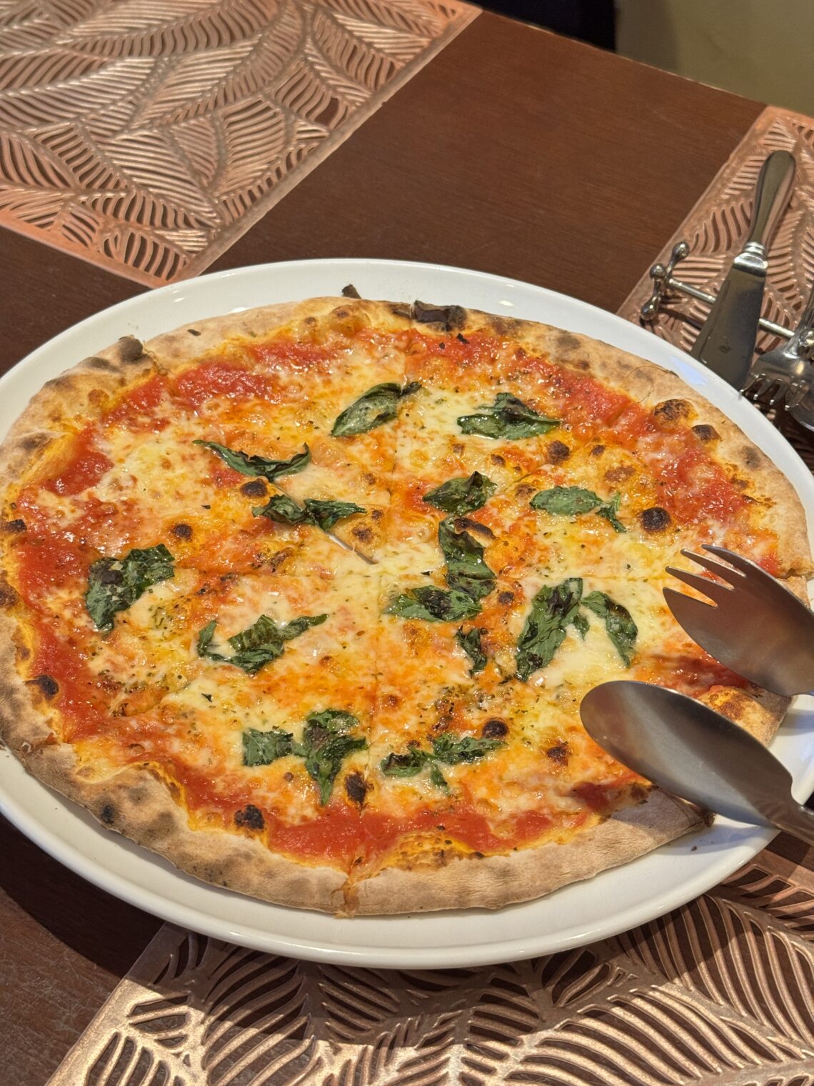 お店に入ると、ピザを焼く美味しそうな匂いにやられて、戦闘モード開始。